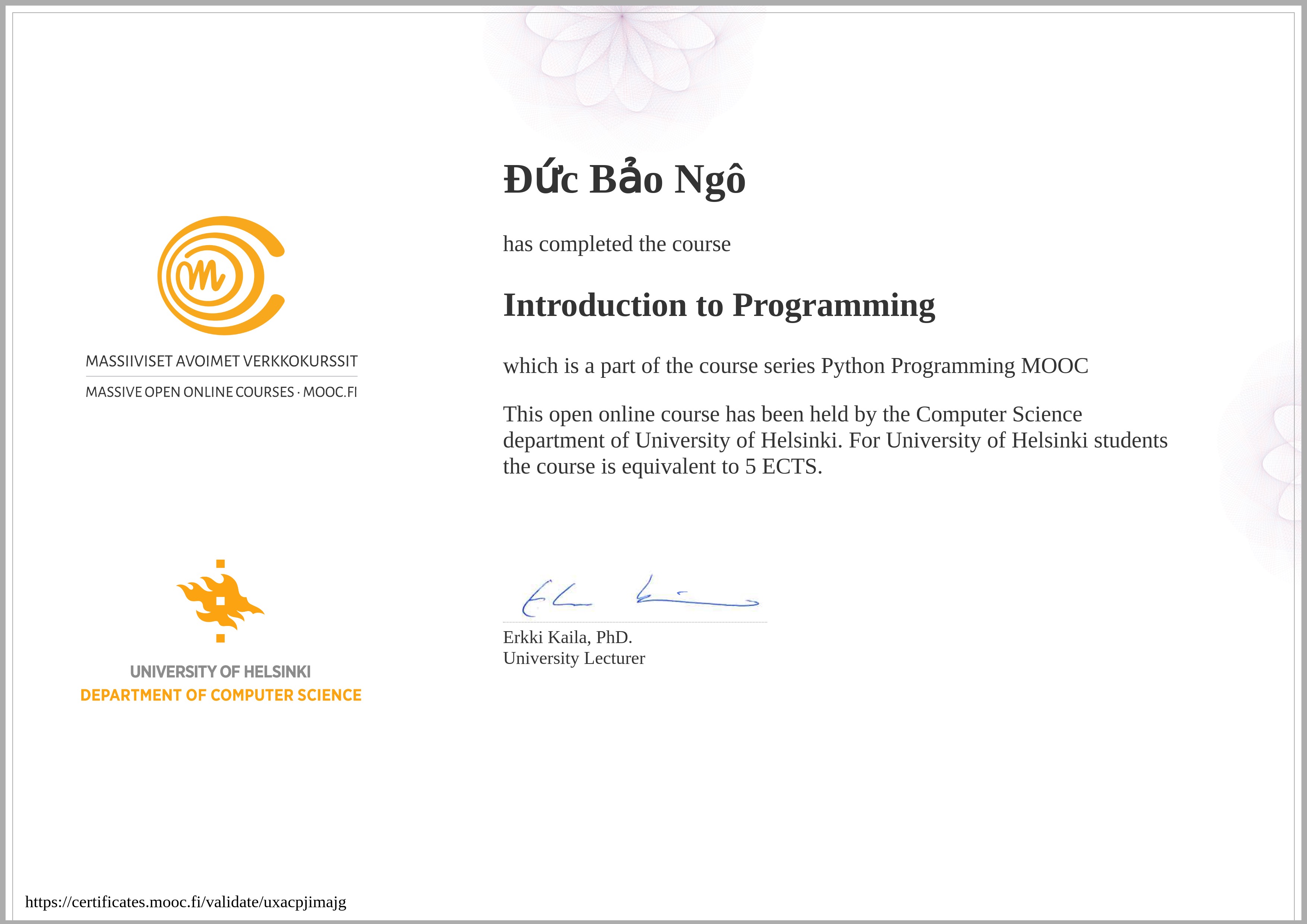 This is my first course at the University of Helsinki. The course is great, with a lot of exercises. I completed this course on on 23 Nov 2024.